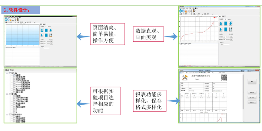 10 | 曲線選擇 | 可根據需要選擇應力-應變、力-位移、力-時間、位移-時間等曲線進行顯示和打??;可隨時切換觀察,任意放大縮小,水平或垂直移動,實時高速采樣; |